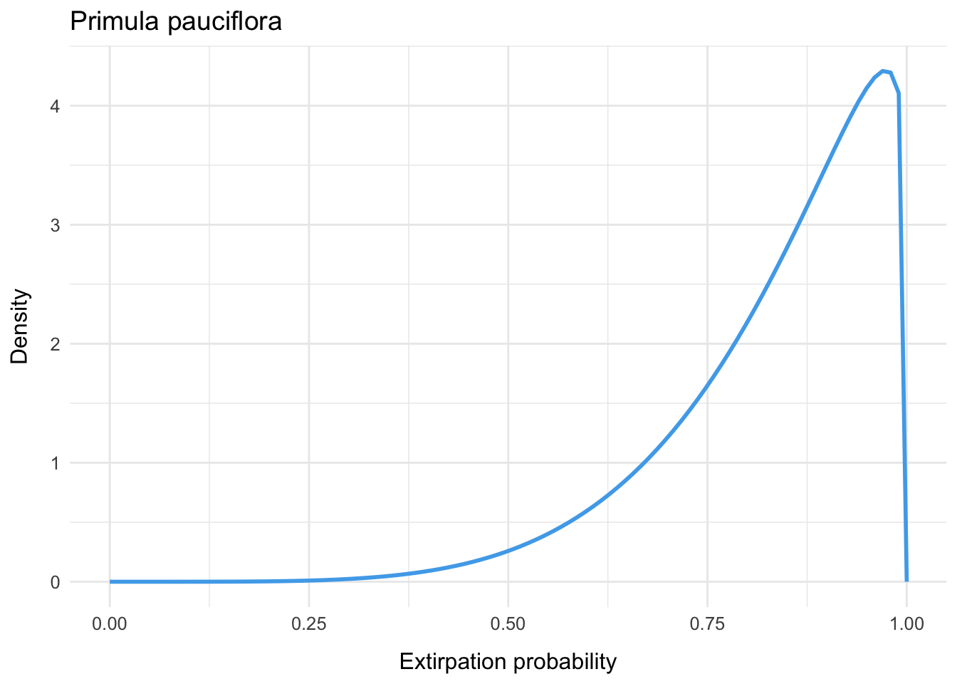 This map plots this mean per-cell posterior extirpation likelihood for Primula pauciflora over both historical and potential habitat.