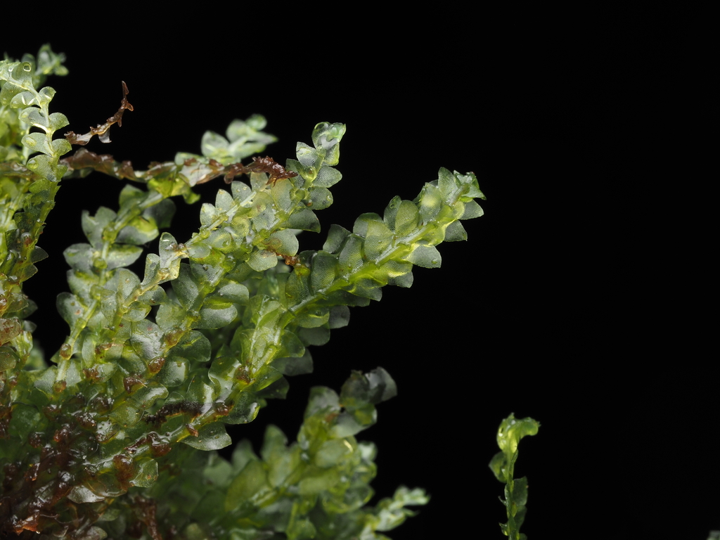 An infrequent species of wet, peaty banks, the light green and relatively large Calypogeia fissa forms long shoots (> 2cm) that loosely weave through other bryophytes. The leaves are somewhat distant and have a rounded-triangular shape and apices that are often notched. The underleaves are diagnostic as they are deeply divided to within a few cells of the base.