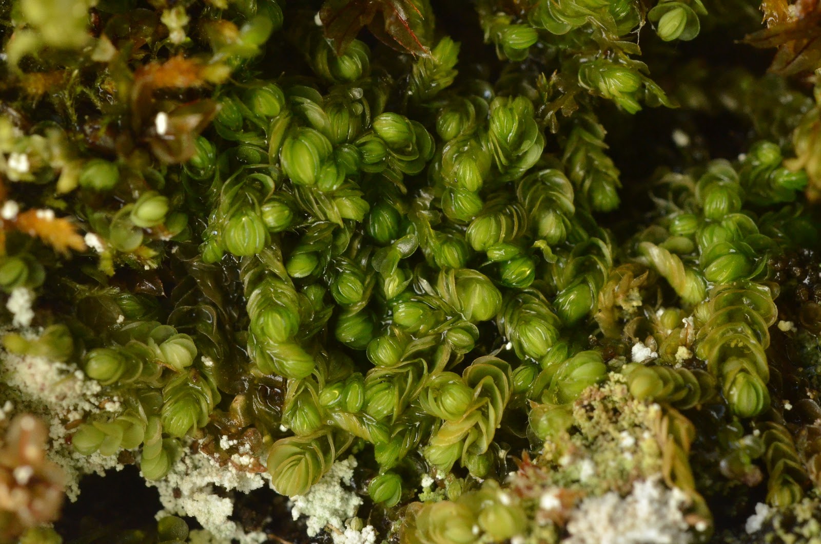 Known from montane calcareous cliff shelves, where it can be found growing in bryophyte mats, A. fennica is a rarely seen species with light green, oppositely-arranged simple leaves on small, reclined shoots that grow to about 1 cm long and up to 1 mm wide. Hand lens inspection shows the small triangular underleaf and lateral leaves that are widely ellipsoidal and fused at their base when looked at on the upper surface of the stem. Some bryologists see blueish hues in this plant,