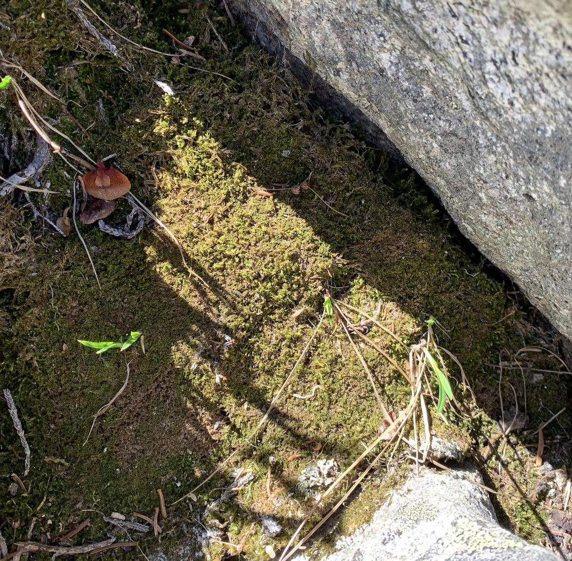 An occasional species of wet bedrock and streamside boulders, B. hatcheri forms variably erect to prostrate large green 4-lobed leafy shoots up to 5 cm tall and around 2 mm wide. The shoots are typically topped by abundant, densely-arrnaged and bright red clusters of asexual reproductive bodies (“gemmae”) that are quite diagnostic within this genus for our region. The lobes of the lateral leaves have sharp tips and descent to down between 20-40% of the leaf’s length. Underleaves are present, and the bases of the lateral leaves are marked by the presence of “cilia” (see photo).