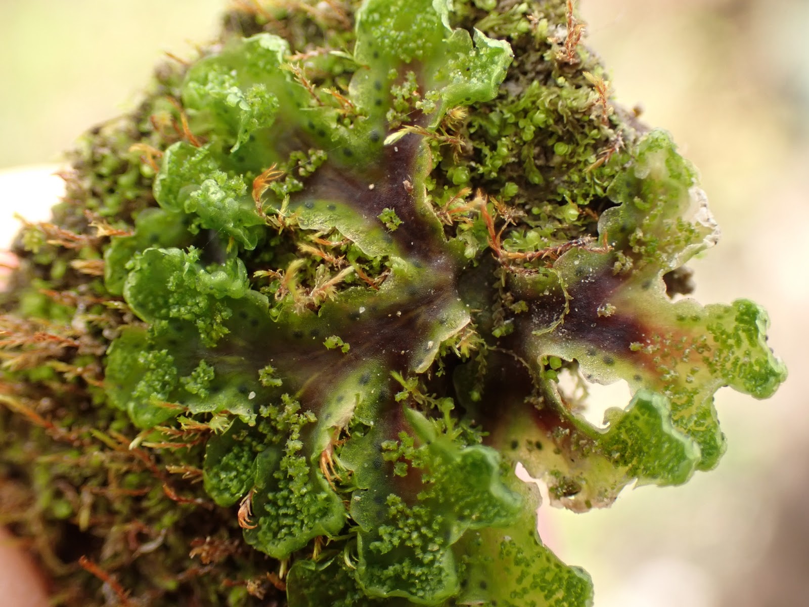 A simple thalloid liverwort with a birght green palour and thallus segments to 1cm wide and more than 1cm long, Blasia pusilla thrives in water-saturated environments where it is often found growing over fine sediments and decaying organic matter. The common name belies its diagnostic feature: bottle or kettle-shaped asexual structures that are reliably present in most plants, as are naked clusters of yellow gemmae on the upper surface. On the occasion that these are absent, the combination of a round-lobed margin, black-dotted thallus and simple linear scales on the upper surface are also unque to this species amongst regional thalloid taxa.