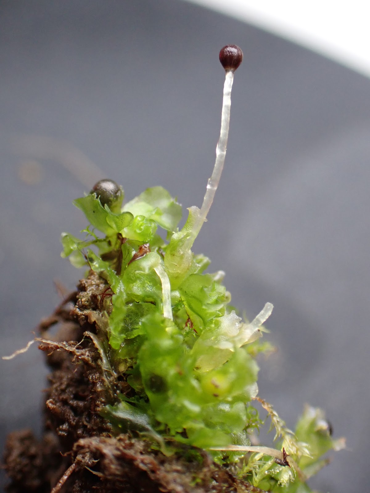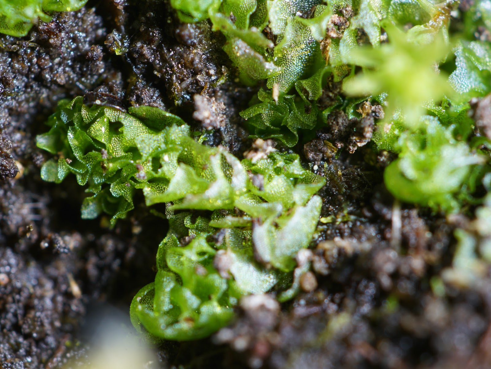 Often obscured by other bryophytes and small grasses on seeping open soils or protected under south-facing rock overhangs, this translucent and frilly green occasional liverwort forms lettuce-like patches (~3-10 mm wide) of sinuous and continuous leaves. Functionally annuals, plants of F. longiseta are so named for the short-lived but tall (up to 3cm), sprout-like sporophyte that emerges in spring. Microscopic examination of the spores are required for identification.