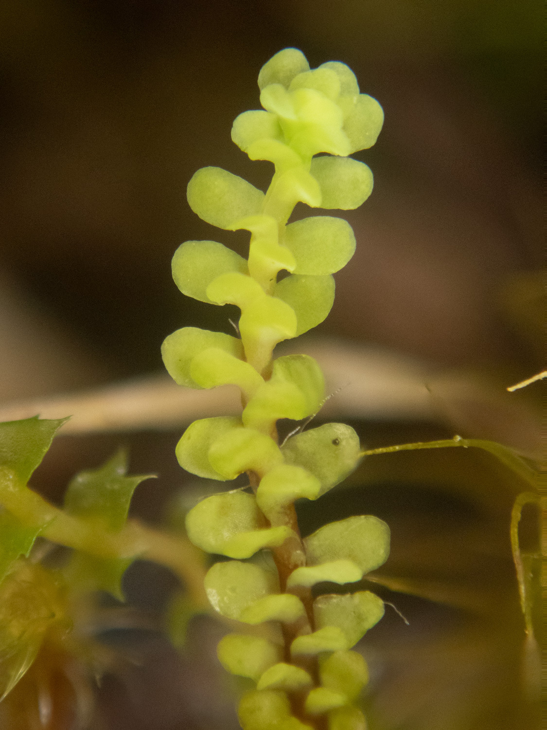 In the montane to alpine habitat where this species thrives, it is unlikely to be mistaken for many other species on account of its girth and closely overlapping leaves. Some species of Scapania (eg. Scapania subalpina) occuring in the same habitats also have smooth, nearly equal lobes, but in M. imbricatum the lobes are elongate and lack the obvious “keel” that connect the upper and lober lobes at their base. Macrodiplophyllum microdontium could concievably occur in similair habitats, but that species has elongate, greatly unequal leaf lobes.