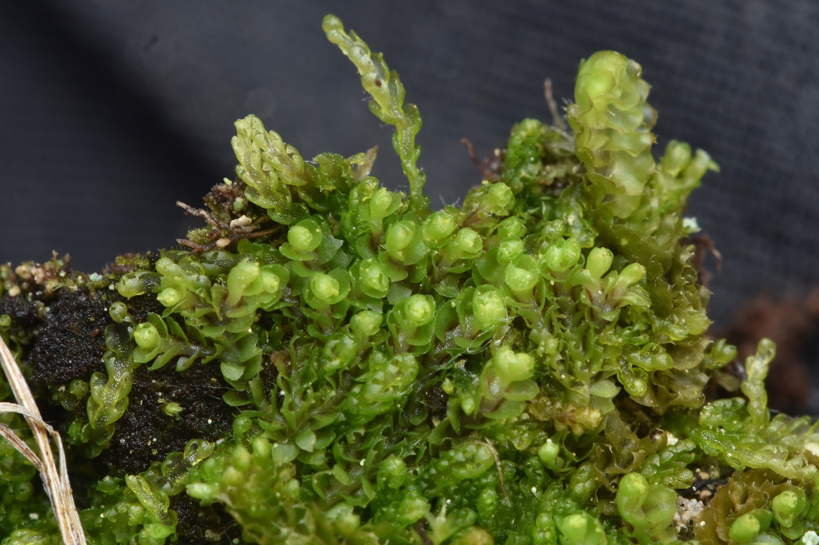 A dark green to scorched infrequent species of montane to arctic habitats, Marsupella sparsifolia forms mats of nearly erect, short shoots up to one centimeter tall and roughly one millimeter wide. The neatly-arranged divergent leaves are wider than the stem, bilobed with round lobes, acute sinus and plane margins. This species is reliably fertile, and antheridia can be found cupped in leaves below the enlarged shoot tips where the developing archegonia and/or sporophytes may be found (“Paroicous”).