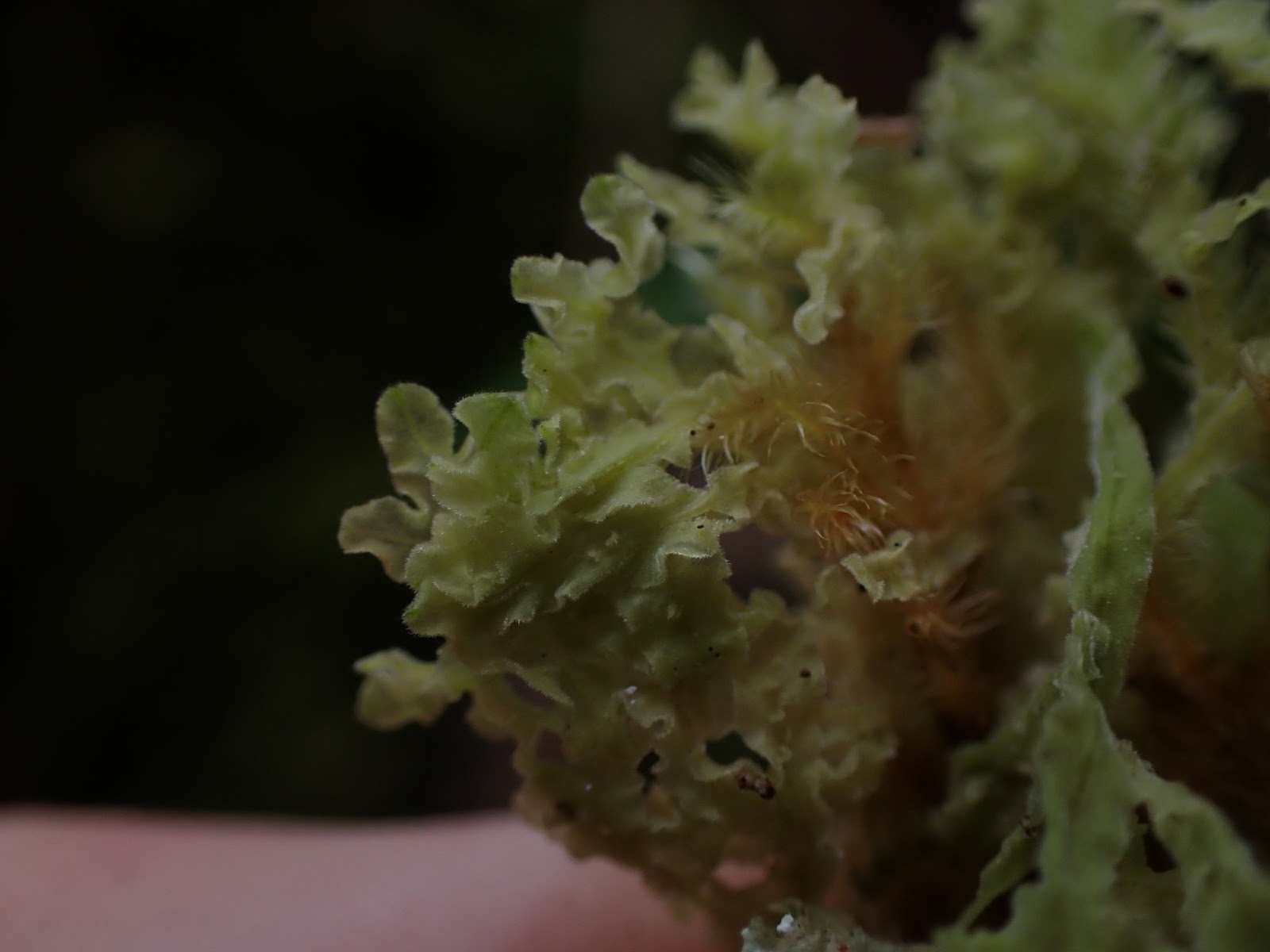A rare but luxuriant (up to 3mm wide), fuzzy and frilly Metzgeria of extremely moist coastal forests, this species forms large convoluted ribbons that jut free some distance from their subsrate. Up close, M. americana is marked by hairs on all surfaces and an excessively ruffled margin.