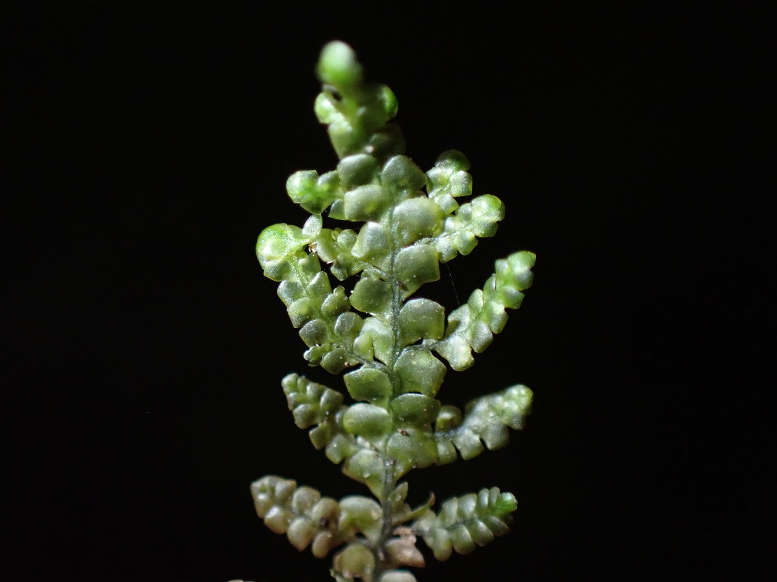 A luxuriant and infrequent species of wet coasts and exceedingly moist canyon microhabitats, R. obtusiloba is a much branched plant with triangular shoots 5-10 cm long and free from the rocks and logs from which they typically grow. Up close, you should see branches emerging out of every leaf along the main stem, producing a feather-like form.